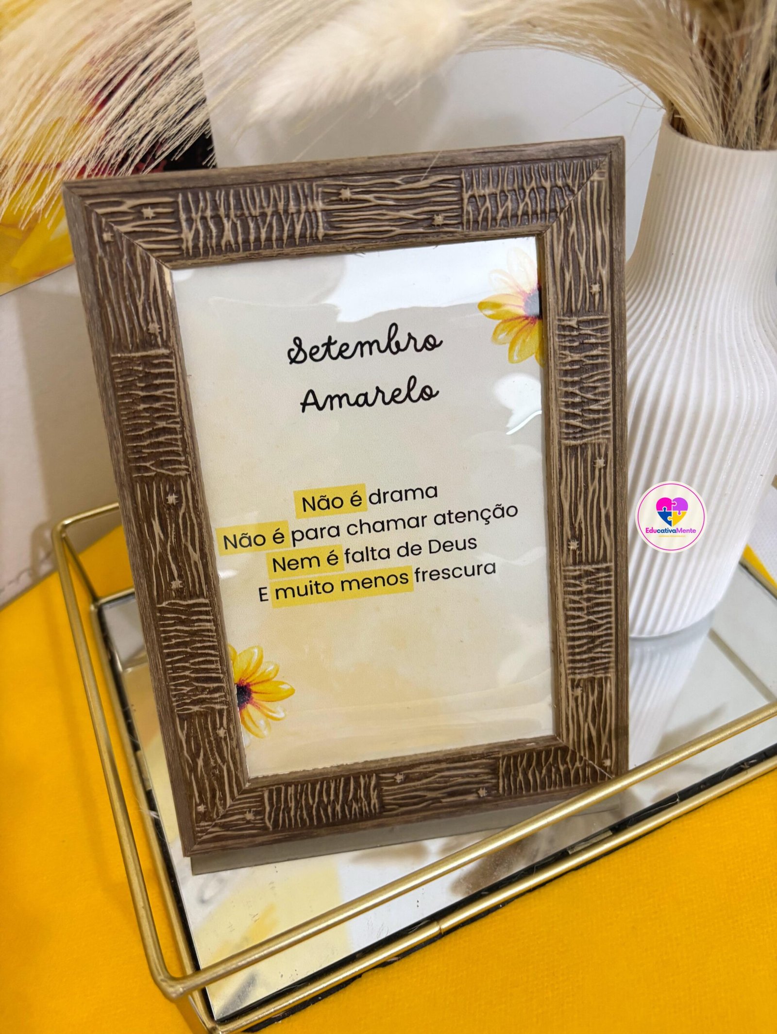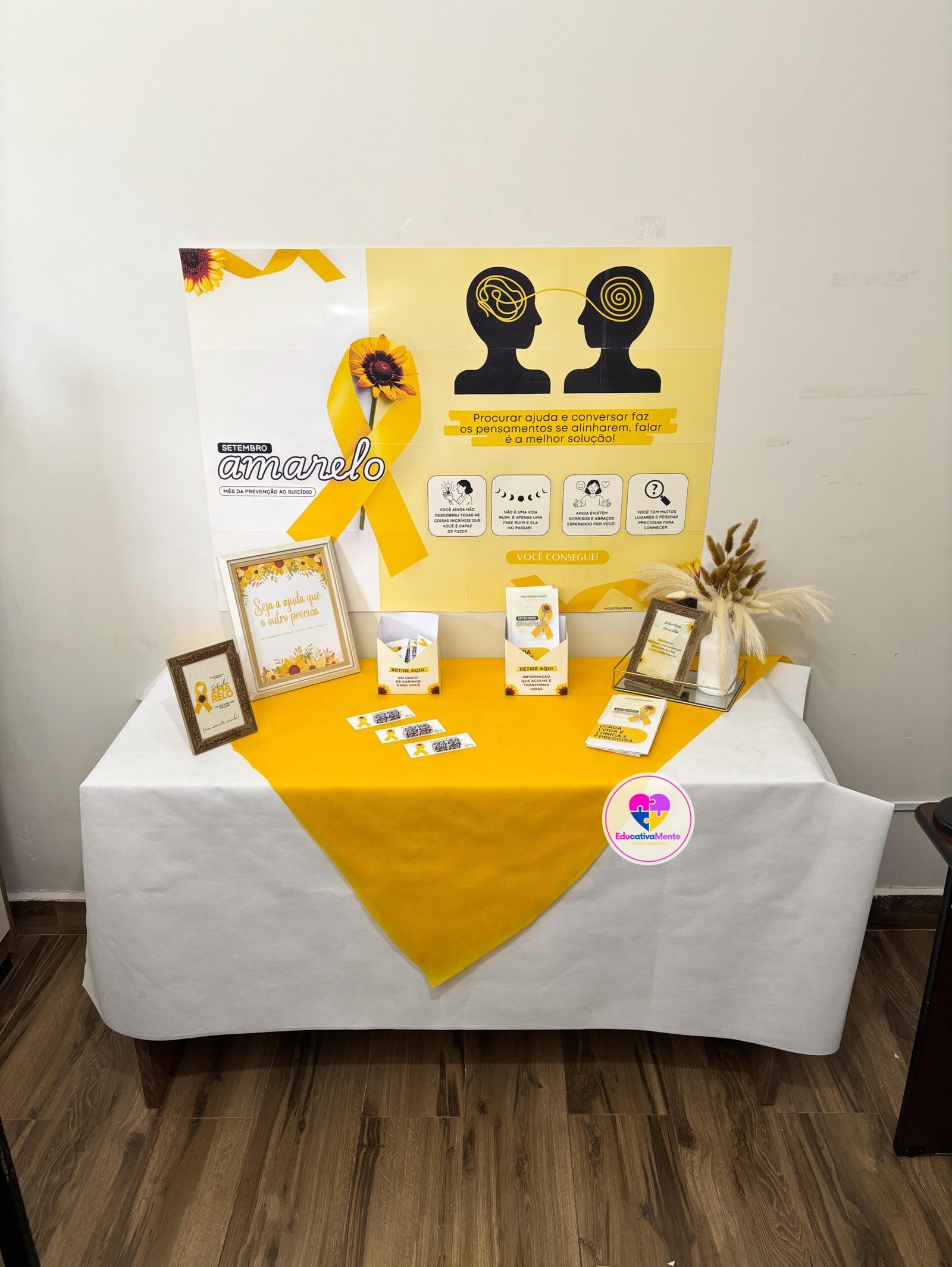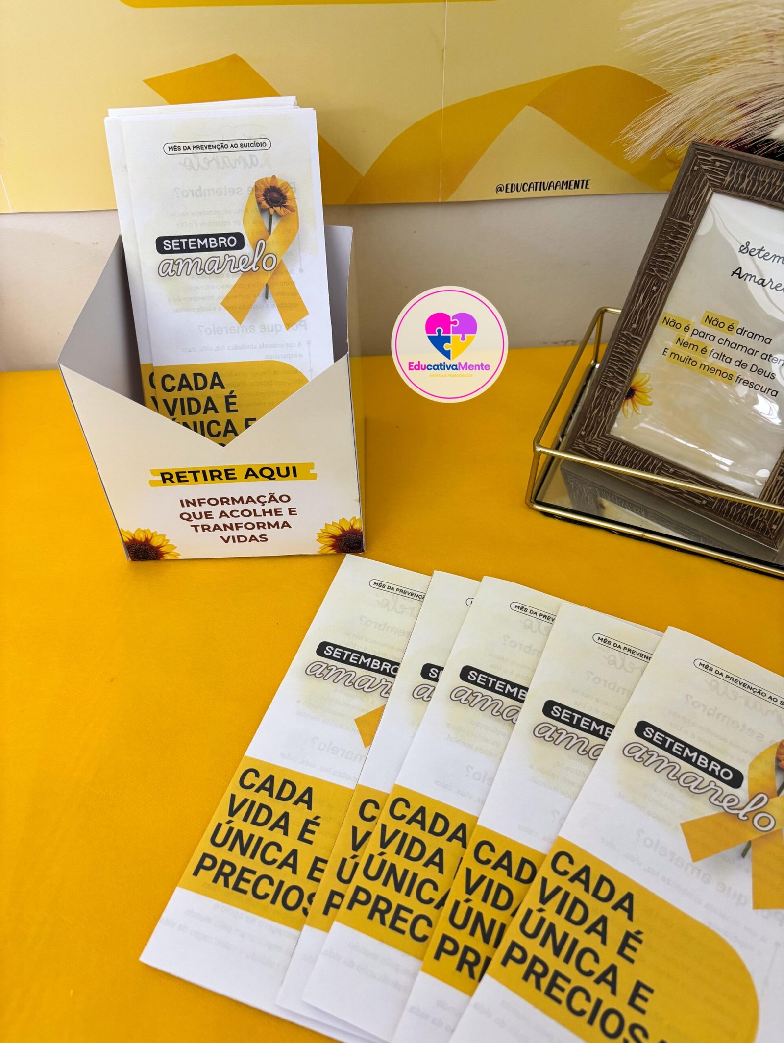 Kit Setembro Amarelo em PDF com painel, porta-retratos, lembrancinhas, caixinhas e folder, ideal para criar um espaço acolhedor e de conscientização sobre a valorização da vida.