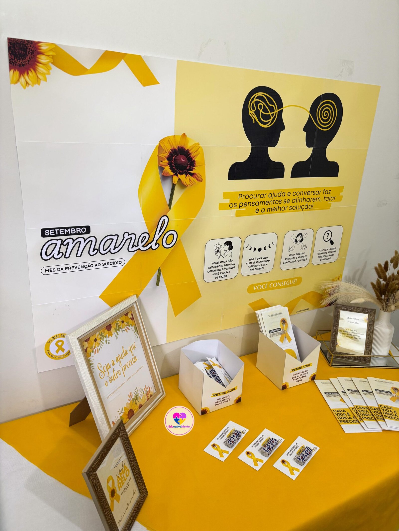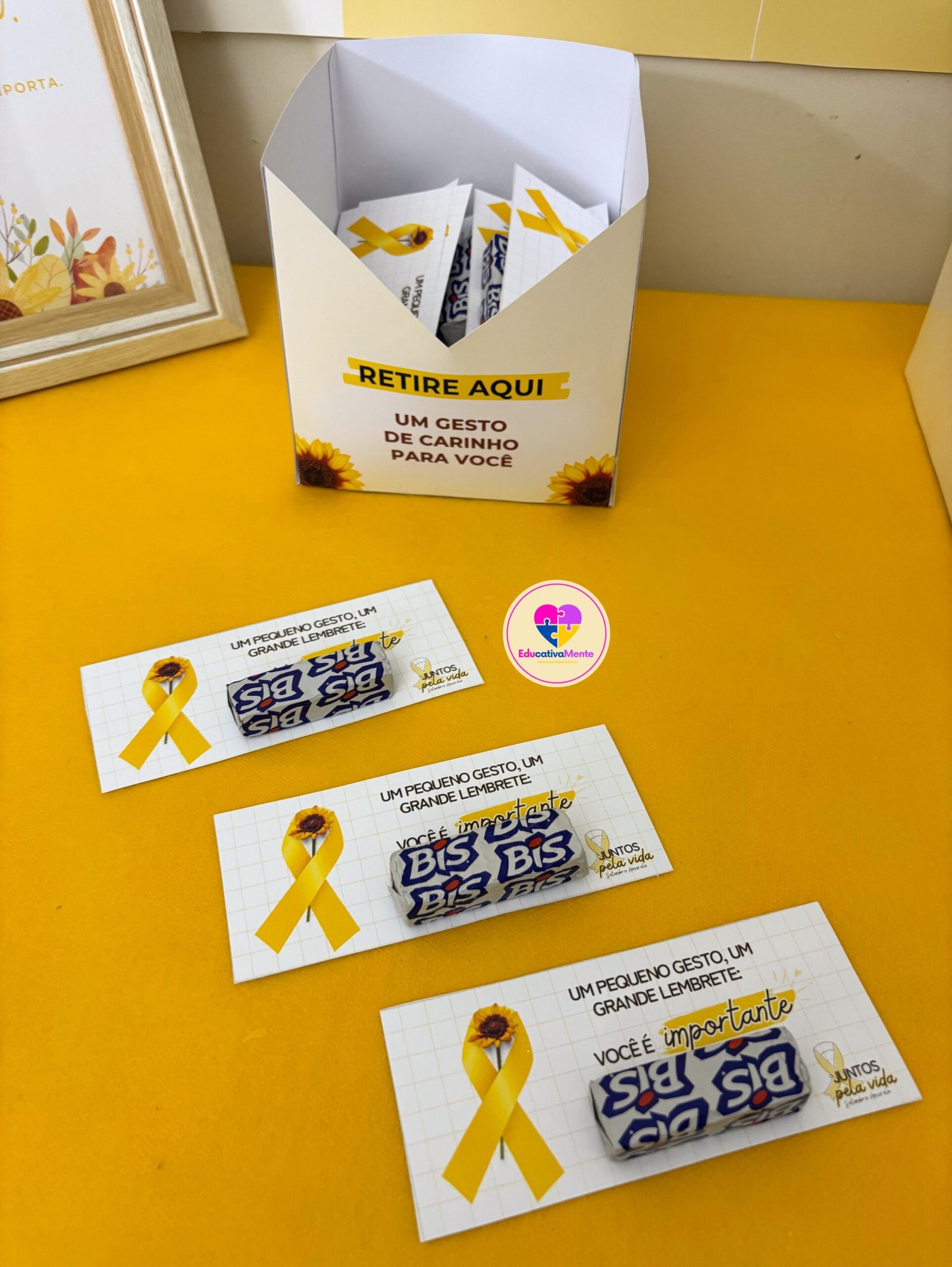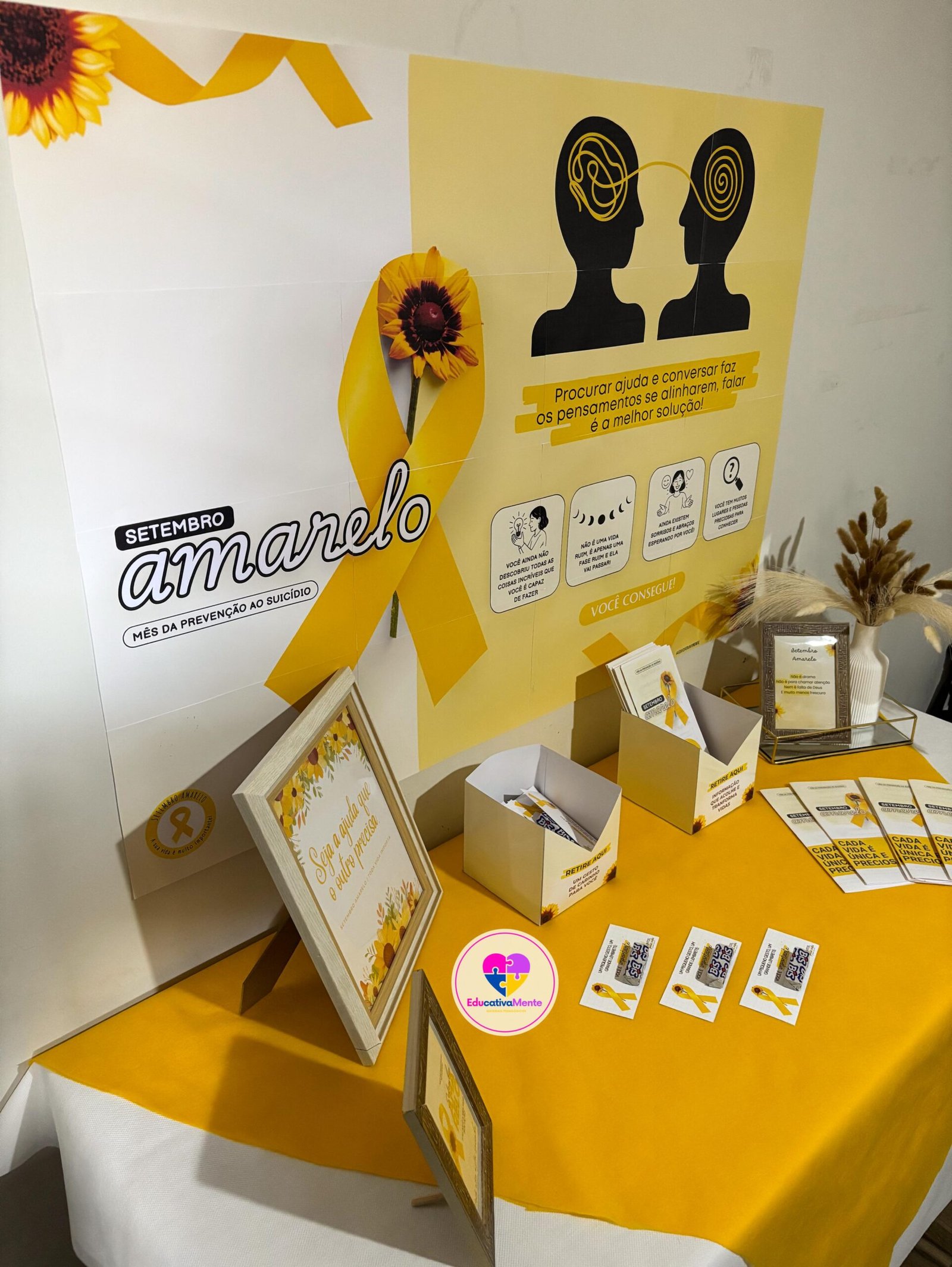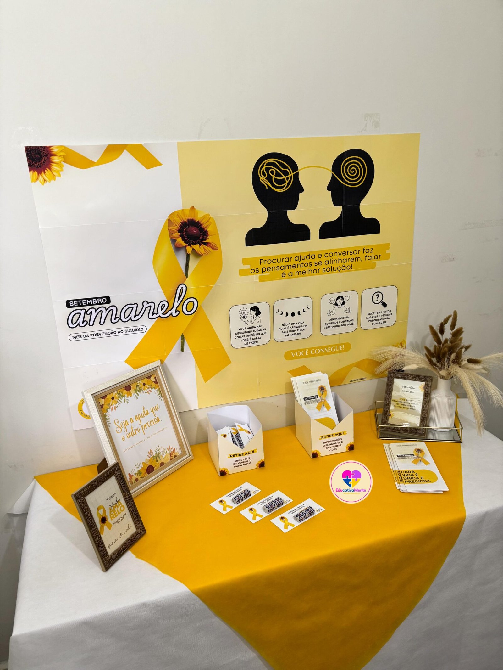 Kit Setembro Amarelo em PDF com painel, porta-retratos, lembrancinhas, caixinhas e folder, ideal para criar um espaço acolhedor e de conscientização sobre a valorização da vida.
