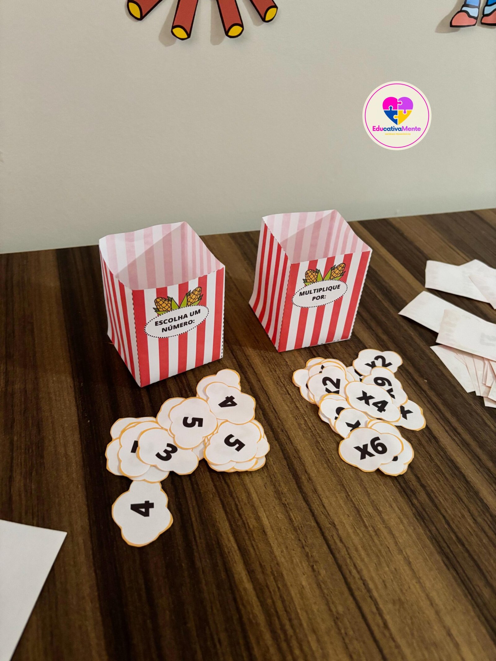 👉 Dinâmica interativa das pipocas para trabalhar a multiplicação (28 operações em molde de pipocas para recorte)