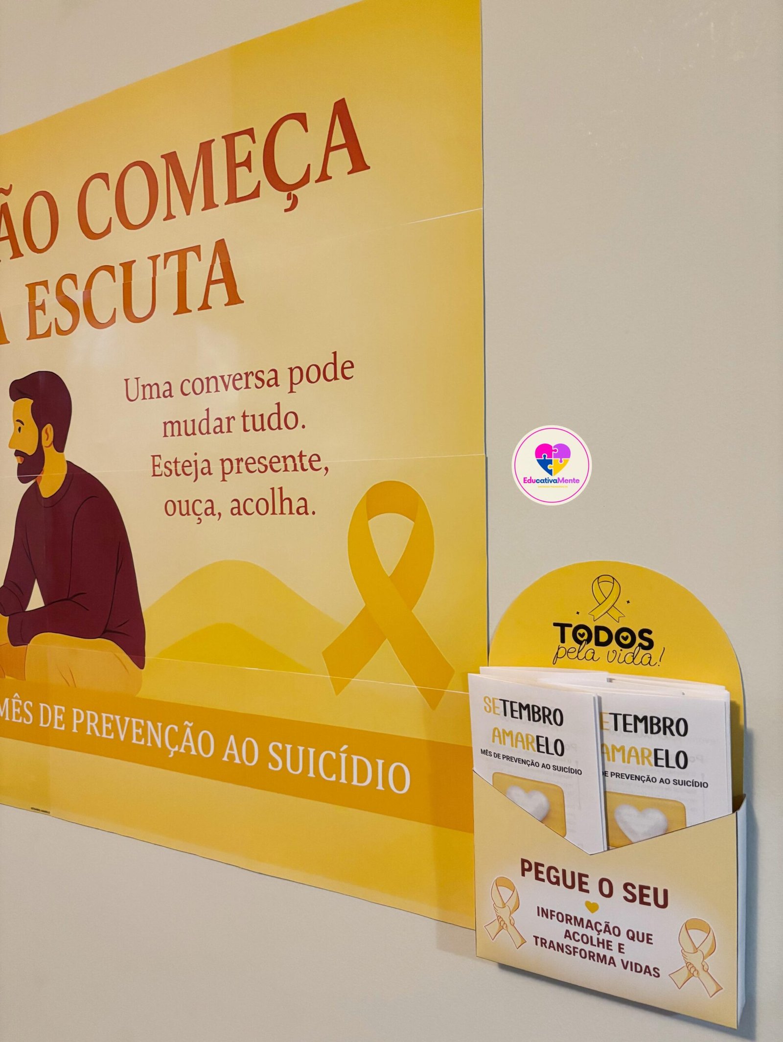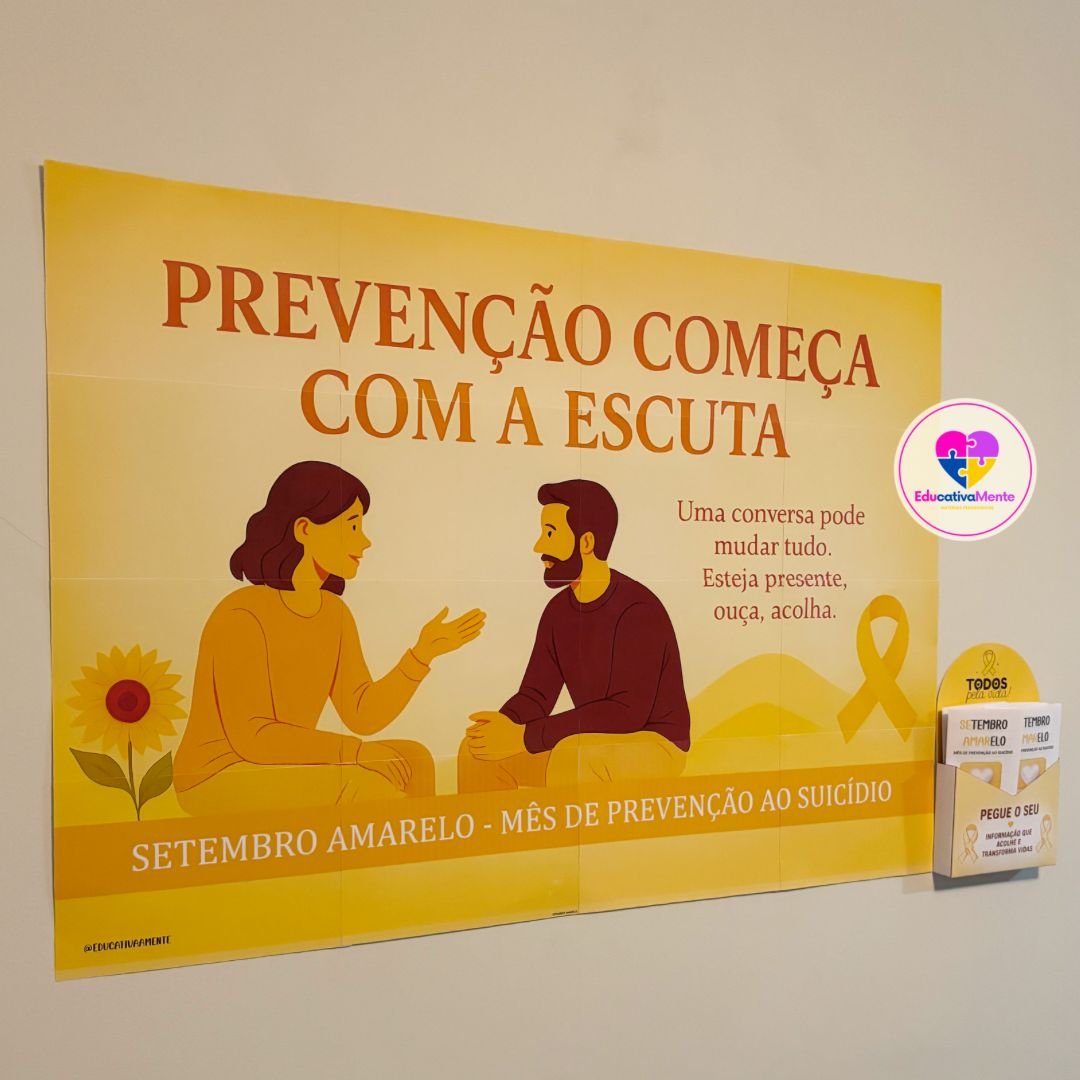 Kit Setembro Amarelo em PDF com painel, folder e moldes prontos para imprimir, ideal para ações de conscientização que reforçam a importância da escuta e do acolhimento.
