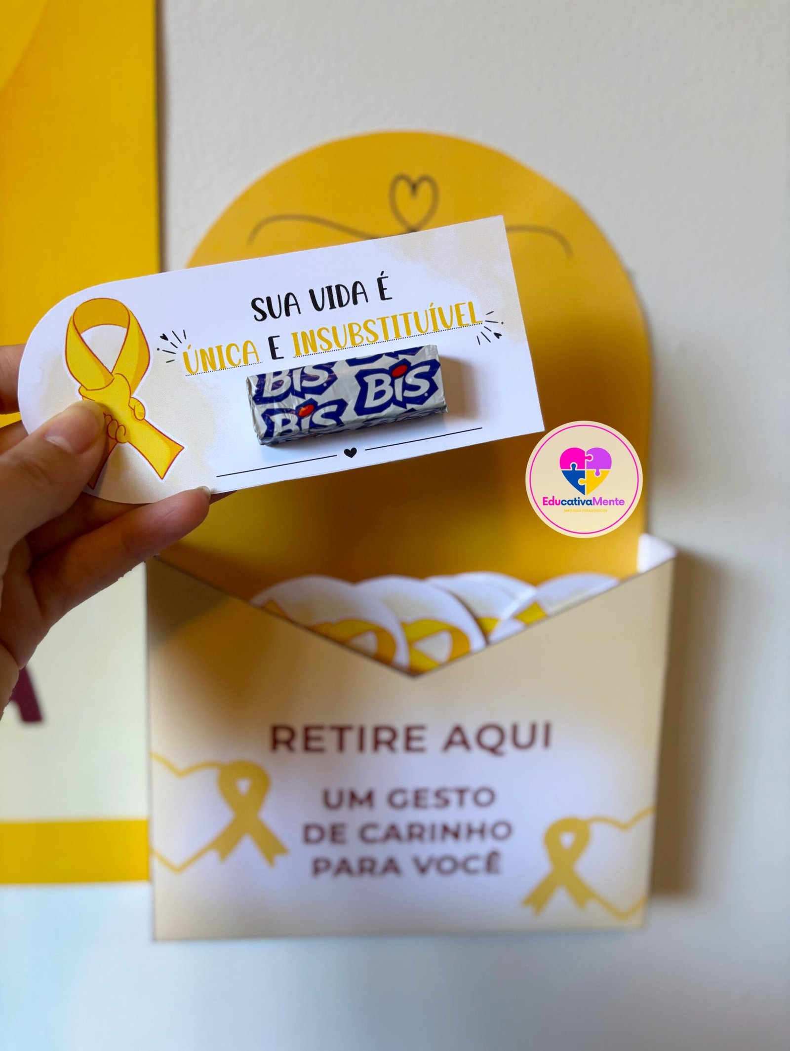 Kit Setembro Amarelo em PDF, pronto para imprimir e montar, com painel, folder, lembrancinhas e moldes. Ideal para ações de conscientização, incentivando gestos de empatia e cuidado.