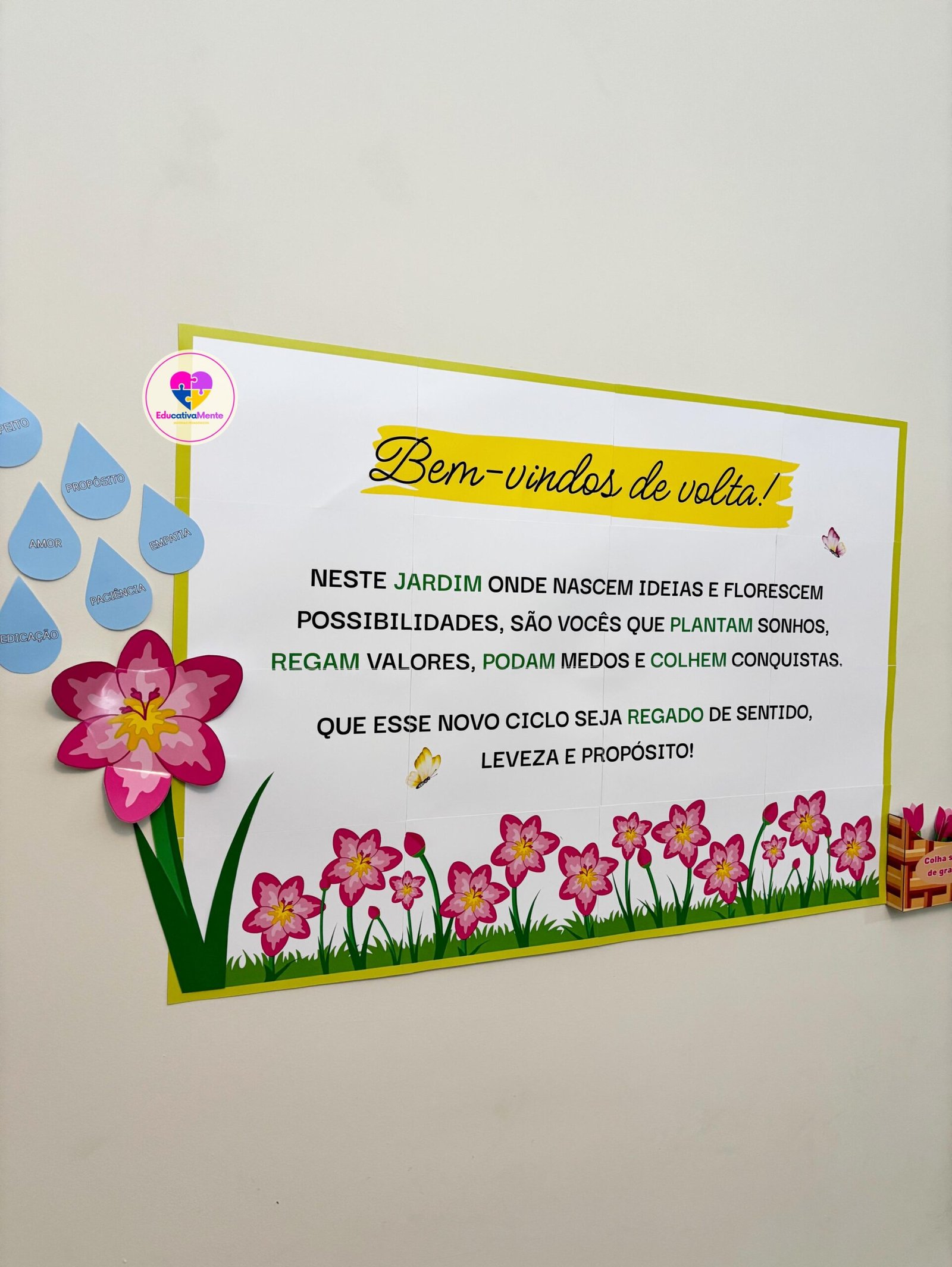 Imagine um mural que floresce boas‑vindas, reforça o espírito de equipe e celebra cada conquista deste semestre. Ao adquirir o Kit Jardim, você recebe um PDF completo e pronto para imprimir, recortar e montar: